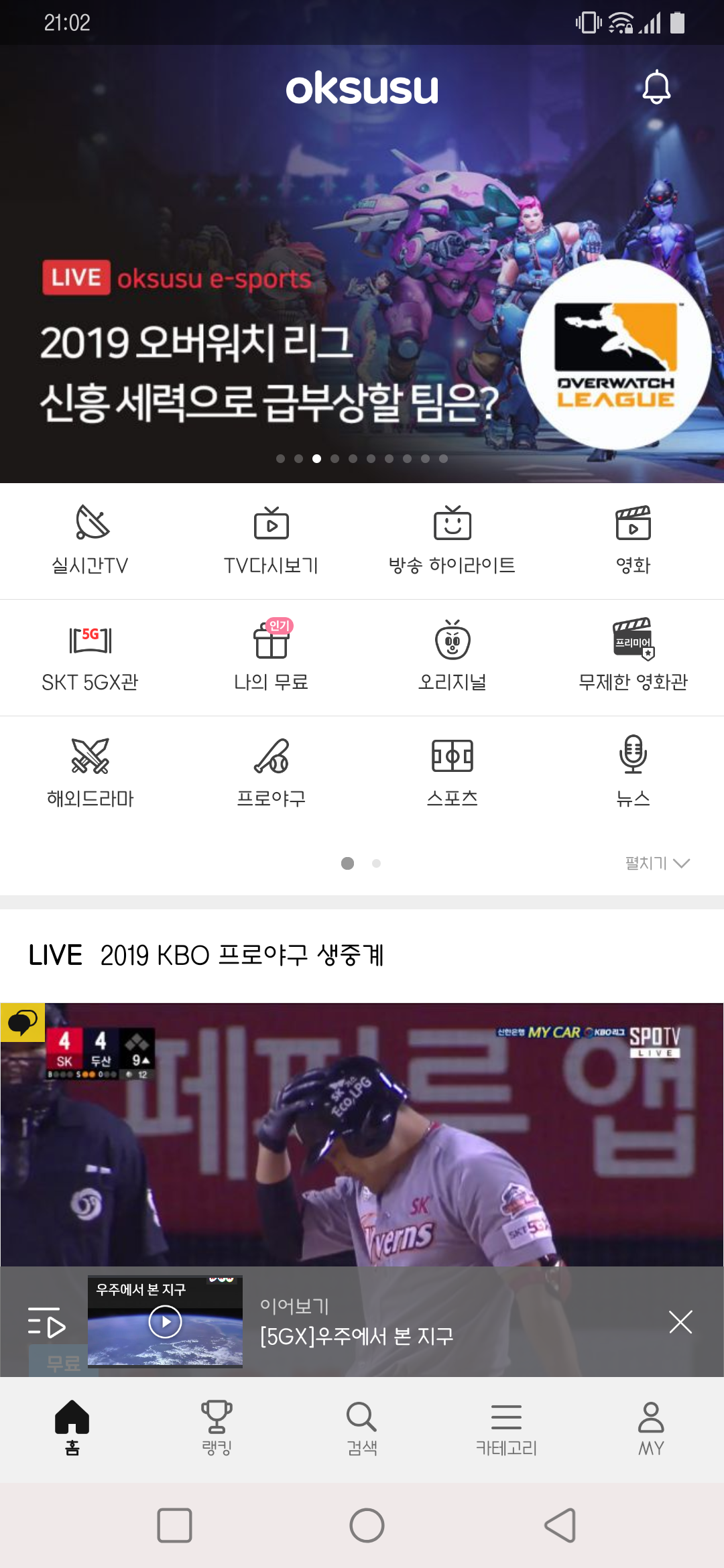 먼저 옥수를 실행하고 좌측 두 번째 열에 있는 SKT 5GX관을 터치해서 들어가요